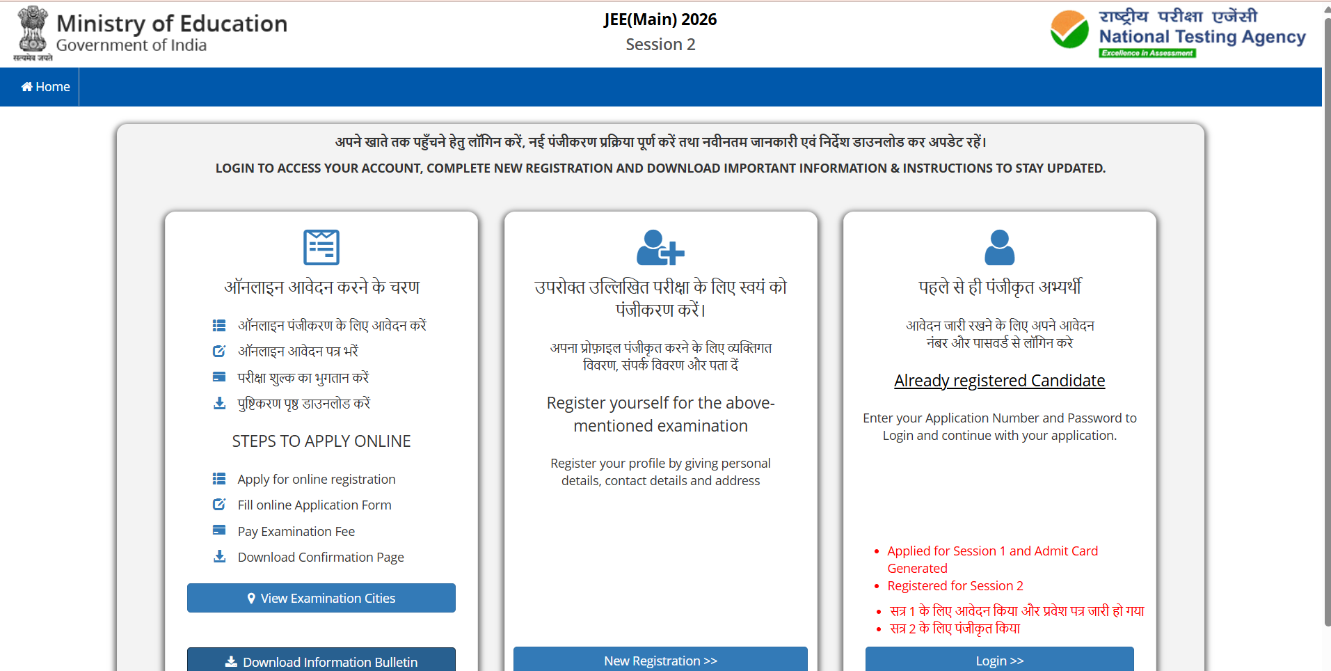 • होमपेज पर, 'कैंडिडेट एक्टिविटी' बोर्ड पर जाकर 'JEE Main 2026 सेशन 2 रजिस्ट्रेशन' पर क्लिक कर सकते हैं।
